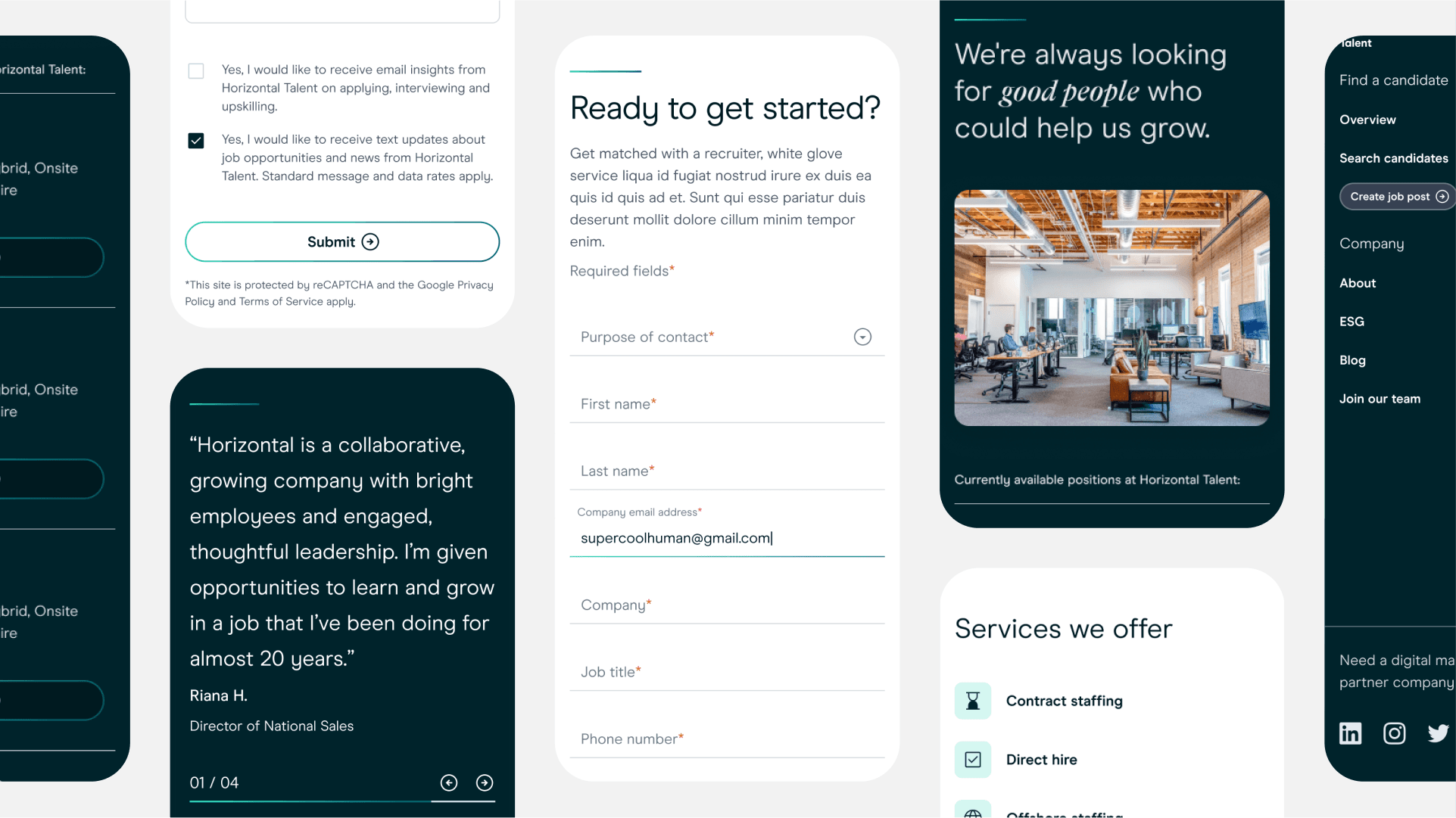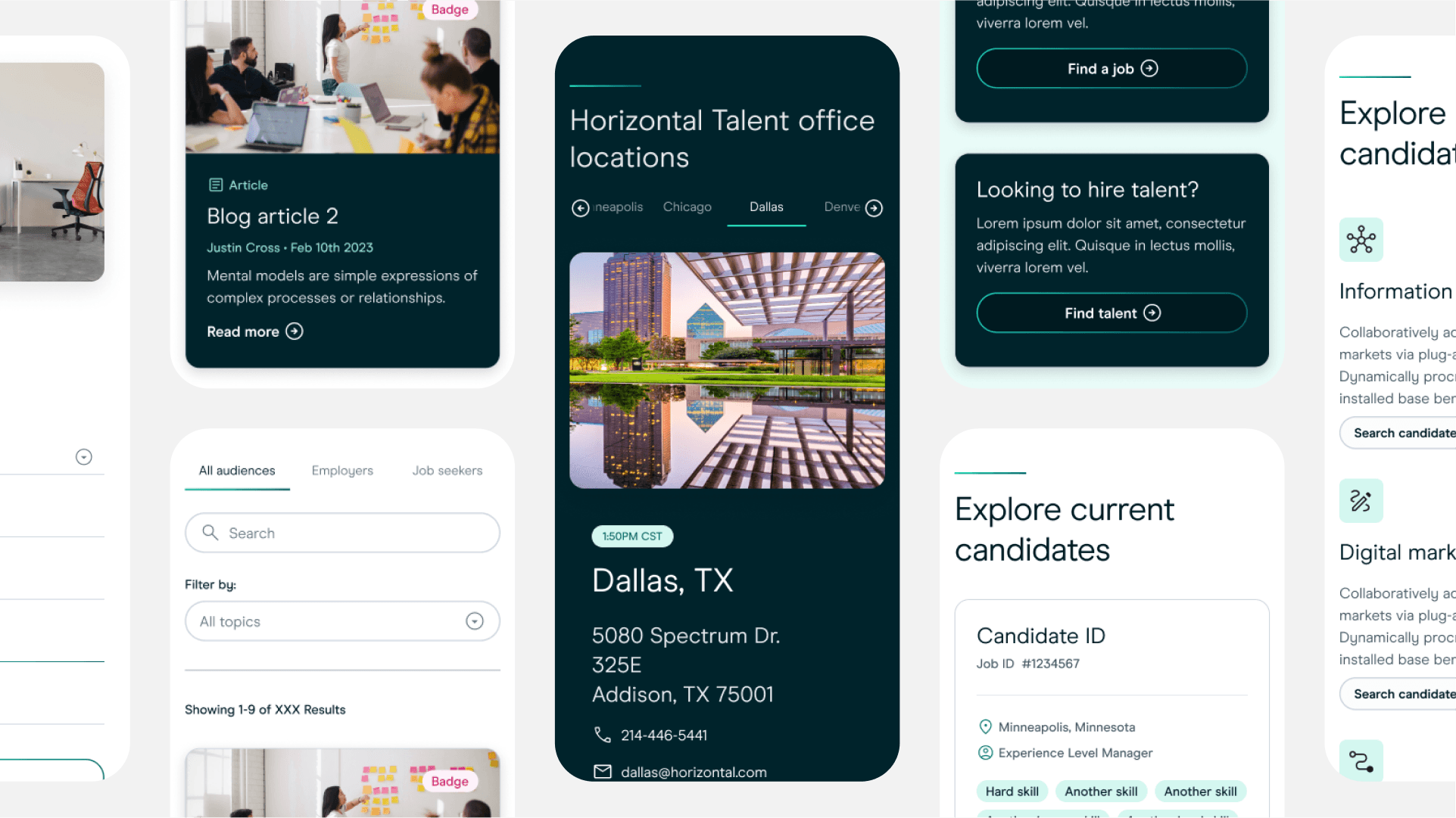 The Horizontal Talent website provides both employers and job seekers with the ability to find their next pivotal hire/role. But the digital experience needed a refresh — in both design and functionality. We redesigned and expanded the company's core brand elements, creating a more premium and human feel that better aligns with Horizontal Talent and their customers. The result: a more elegant, streamlined experience that connects more people to bigger opportunities. Product Management: Nikki Fulp Art Direction/Design/UI: Dan Timm, Matt Kuglistch UX: Kathryn Deming, Sam Jorgensen Copywriting: Justin Cross